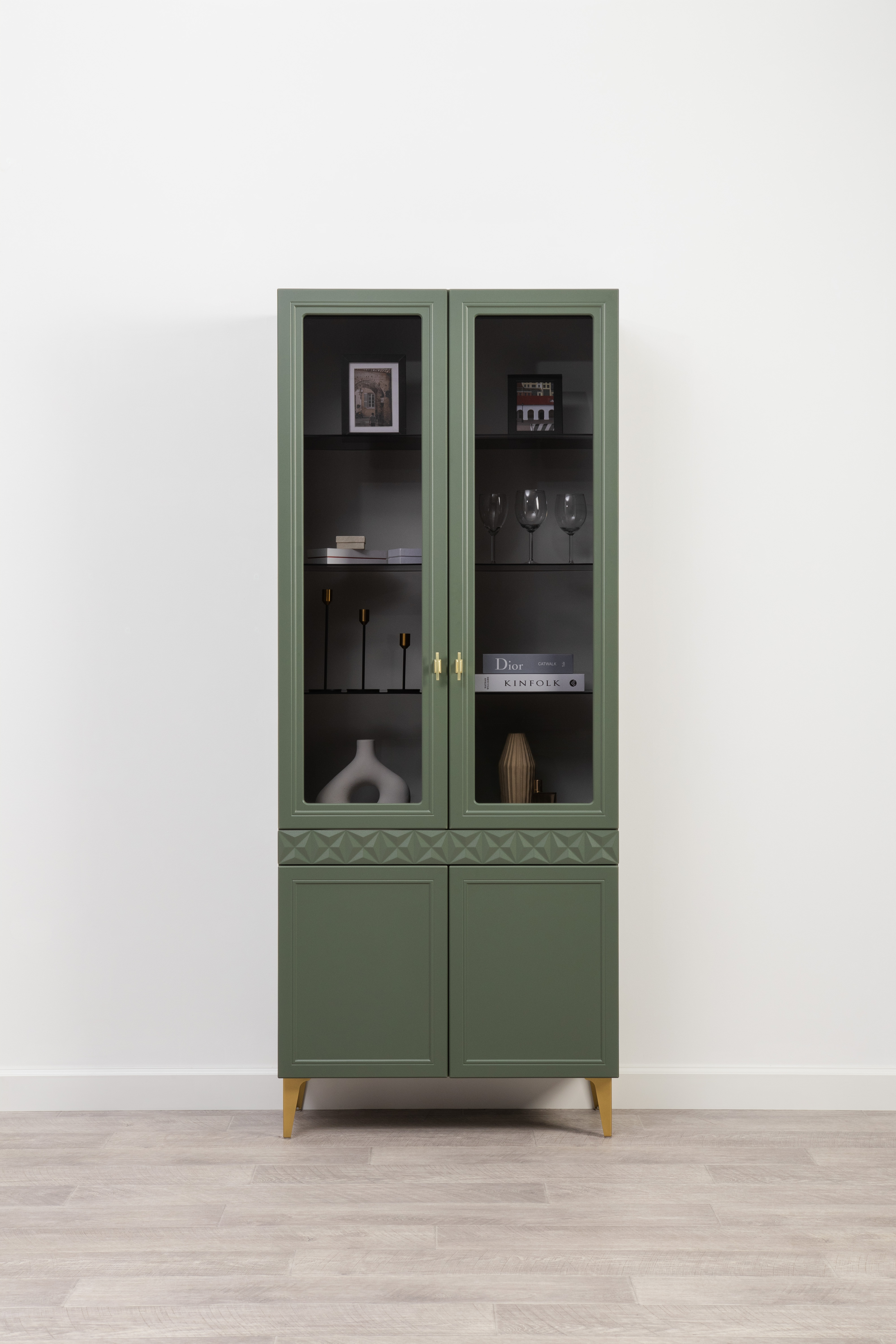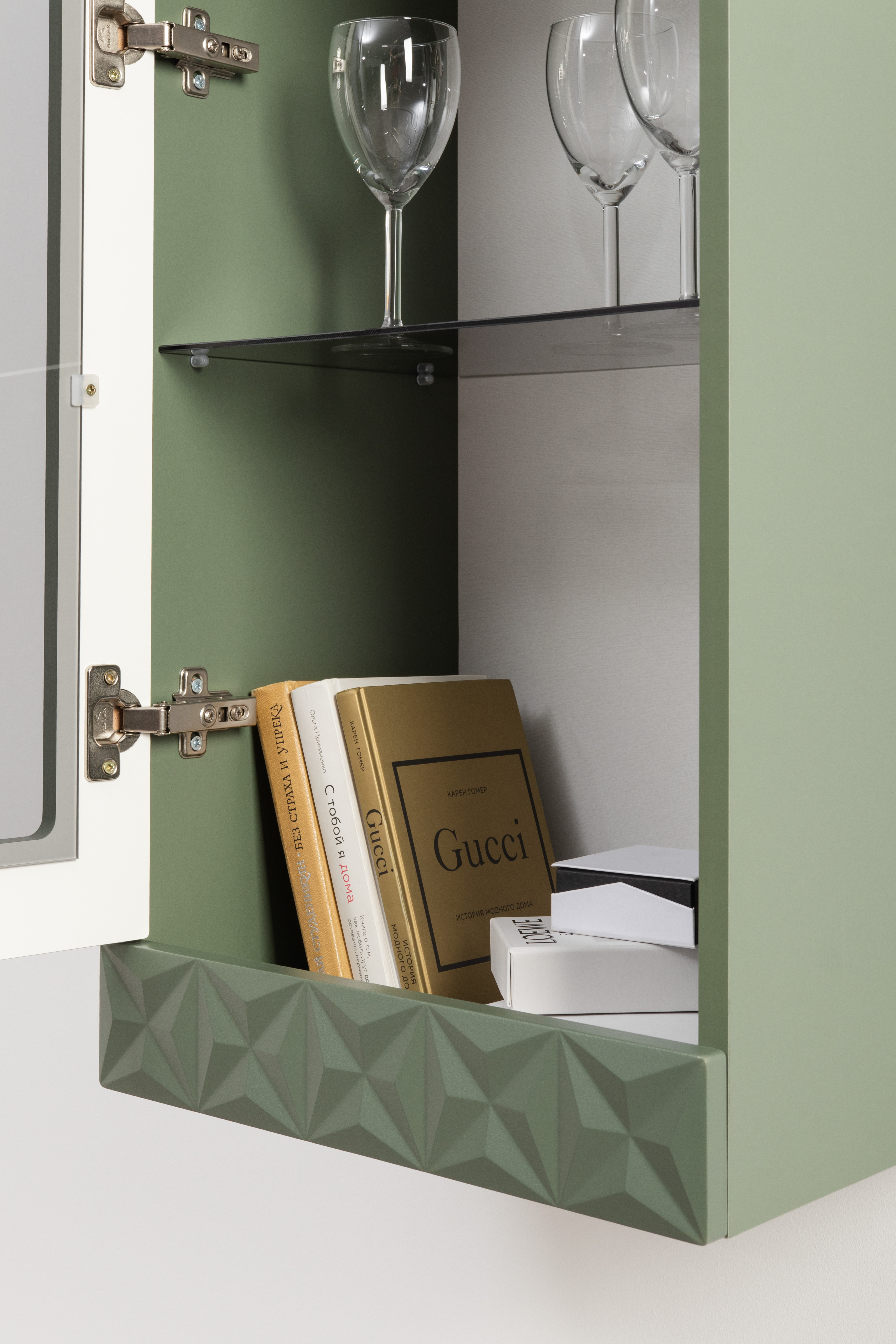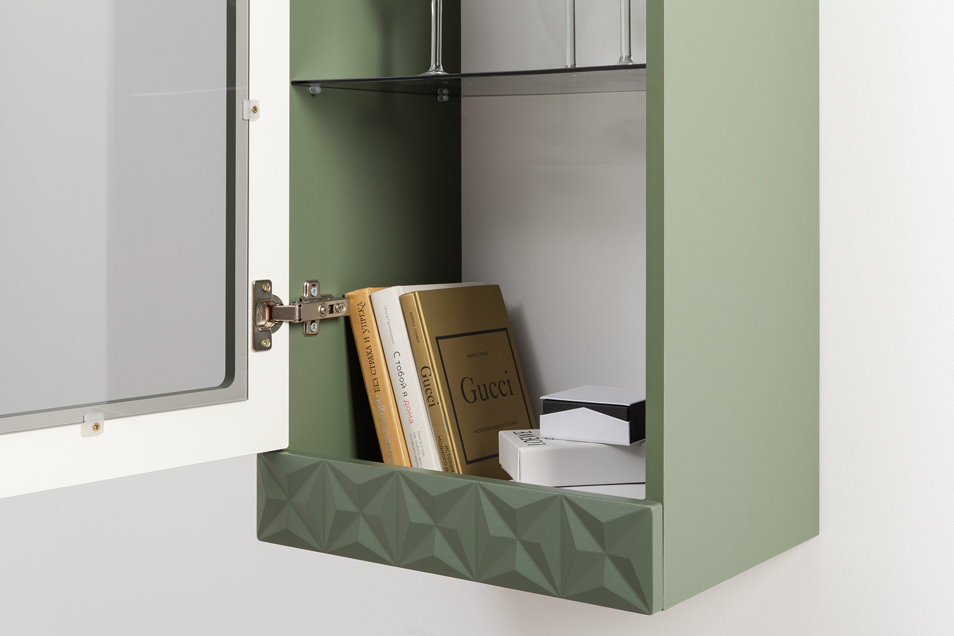 В коллекции представлены три типа витрин с тонированным закалённым стеклом, которые придают пространству лёгкость и свет. «Марион» — идеальное сочетание традиций и актуального дизайна в каждой детали.