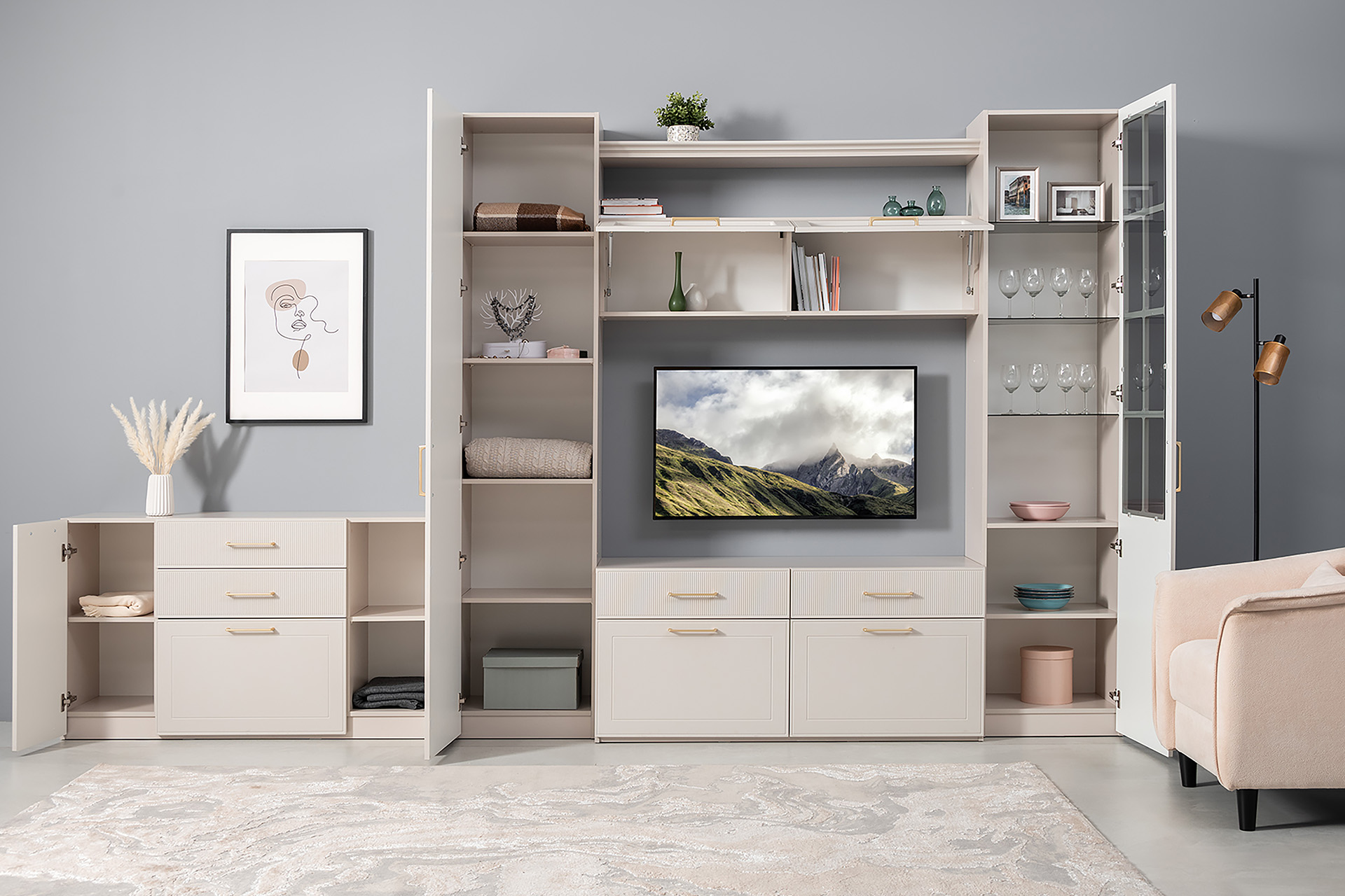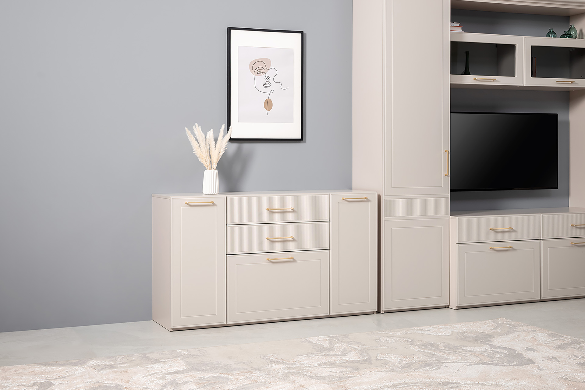 Тумба под ТВ Ричфорд 16.61 кашемир 5981 BS, моно керамика D166-2 ПВХ, белый PE шагрень
