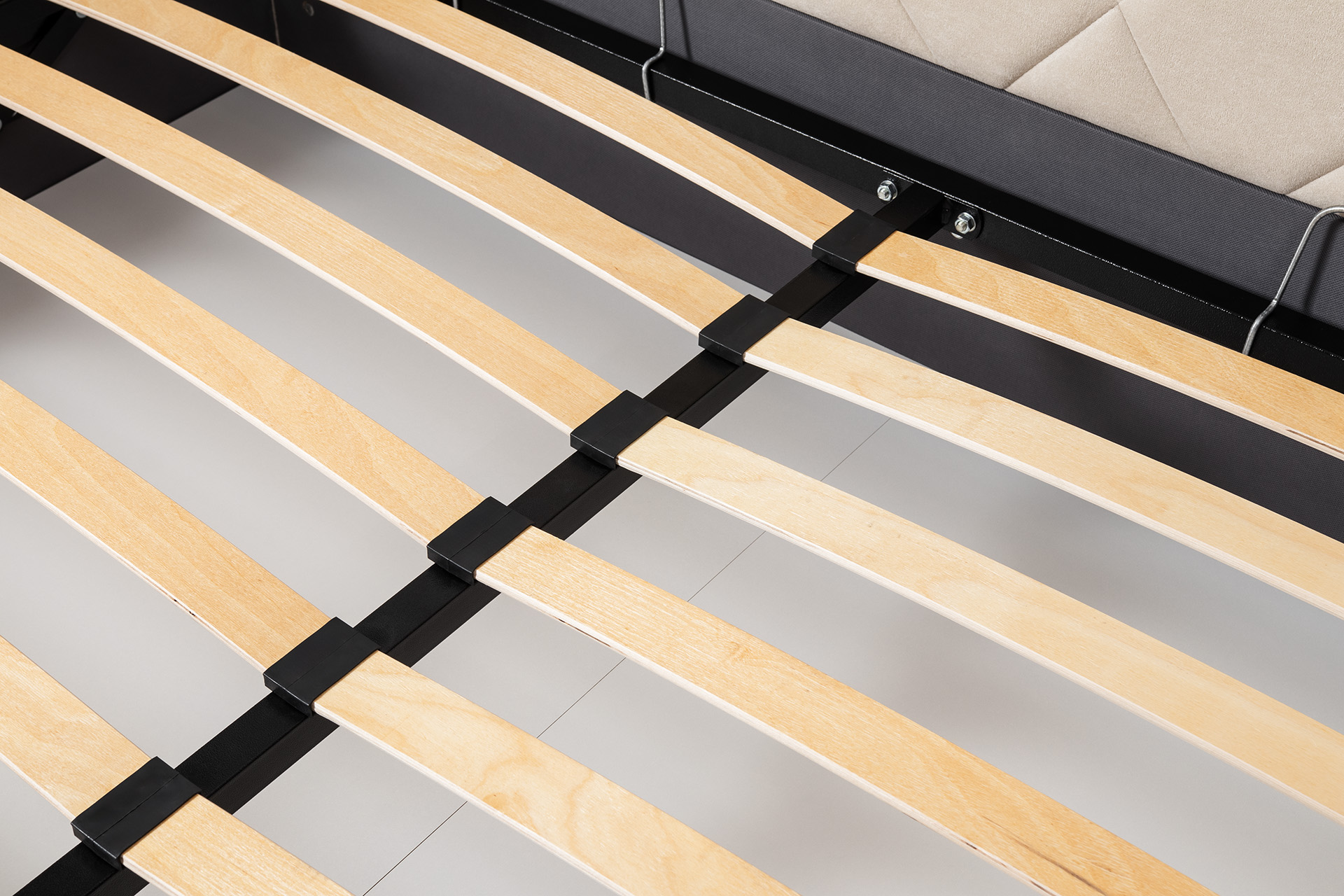Основание кровати укомплектовано матрасодержателями. Жесткое кроватное дно из ЛДСП 16 мм на опорах 25 мм.