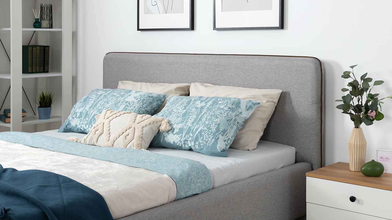 Кровать Миа 140 рогожка светло-синий, кант желтовато-коричневый с ортопедическим основанием и подъемным механизмом