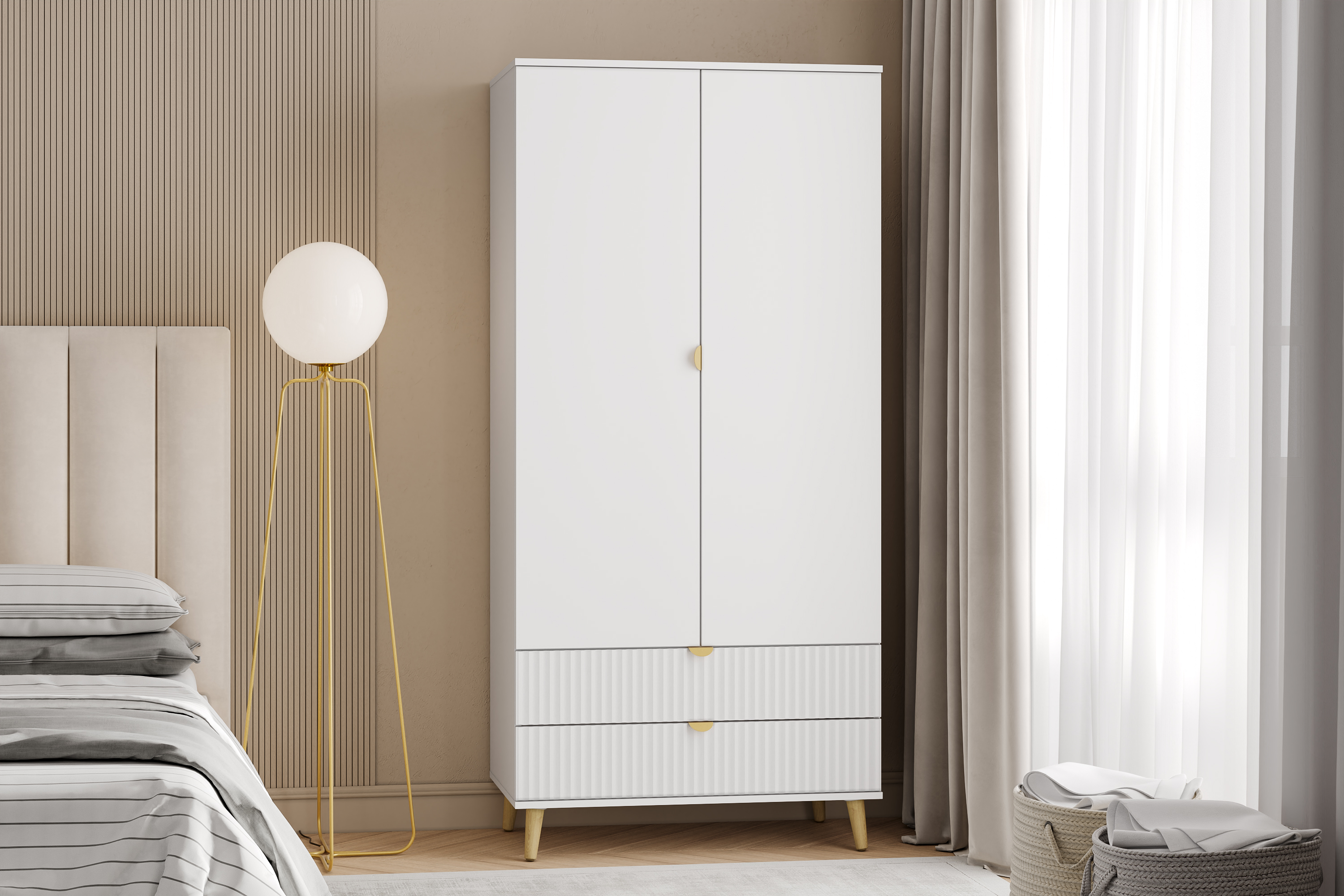 Модульная композиция включает тумбу, оснащенную выдвижными ящиками, которые открываются плавно и бесшумно благодаря шариковым направляющим, а в шкафу удобно организовать предметы одежды, при этом высокие опоры облегчают процесс уборки.