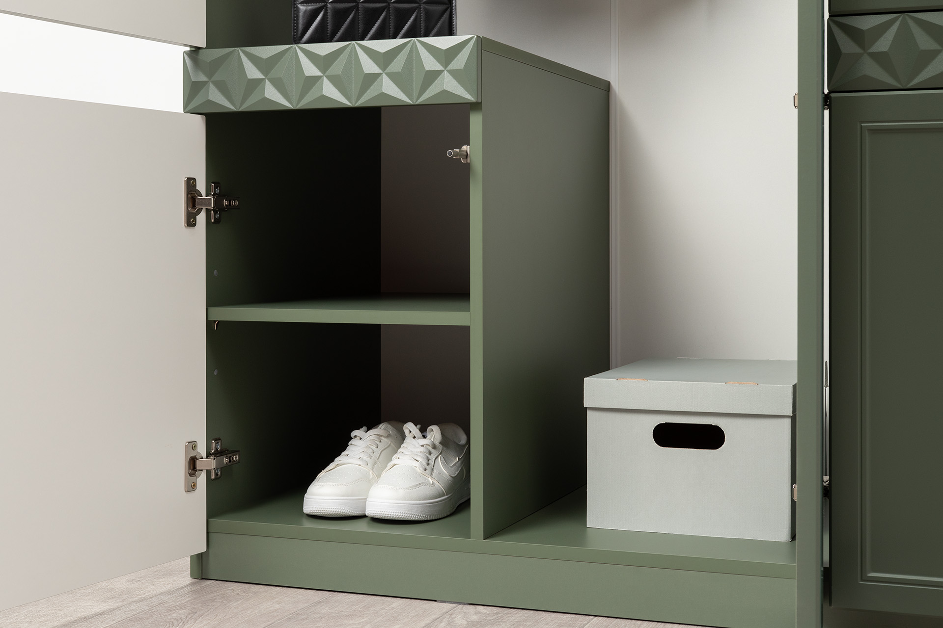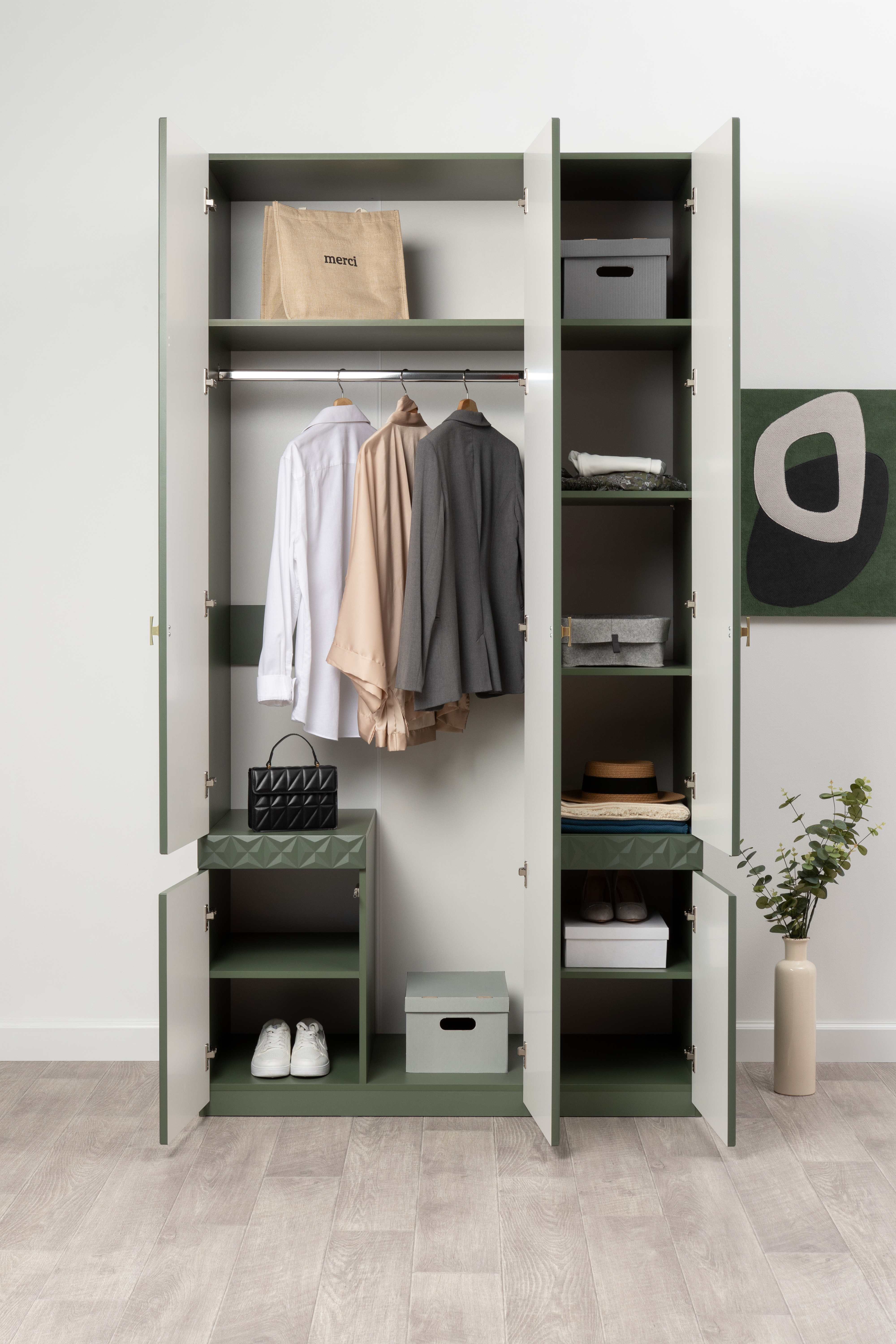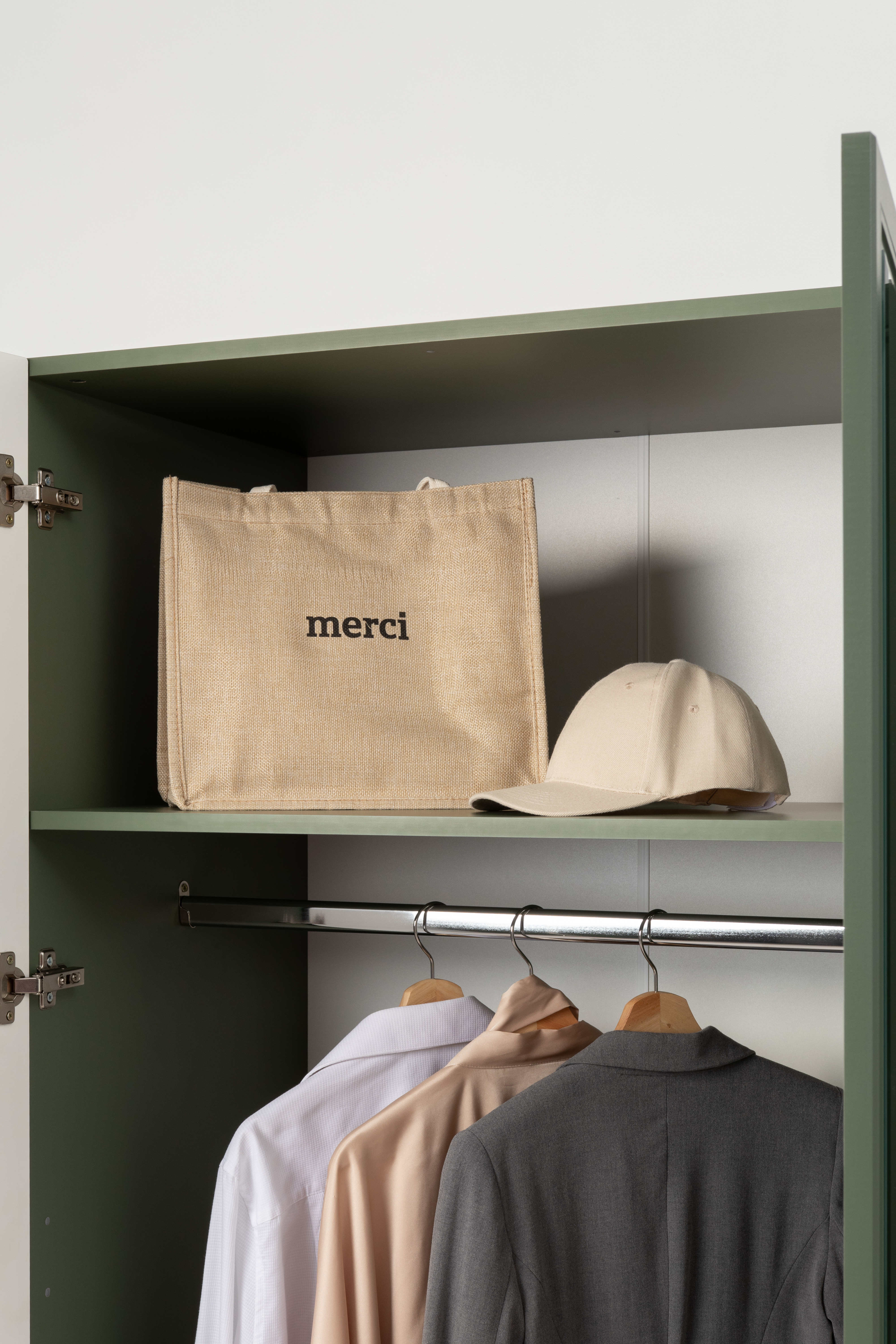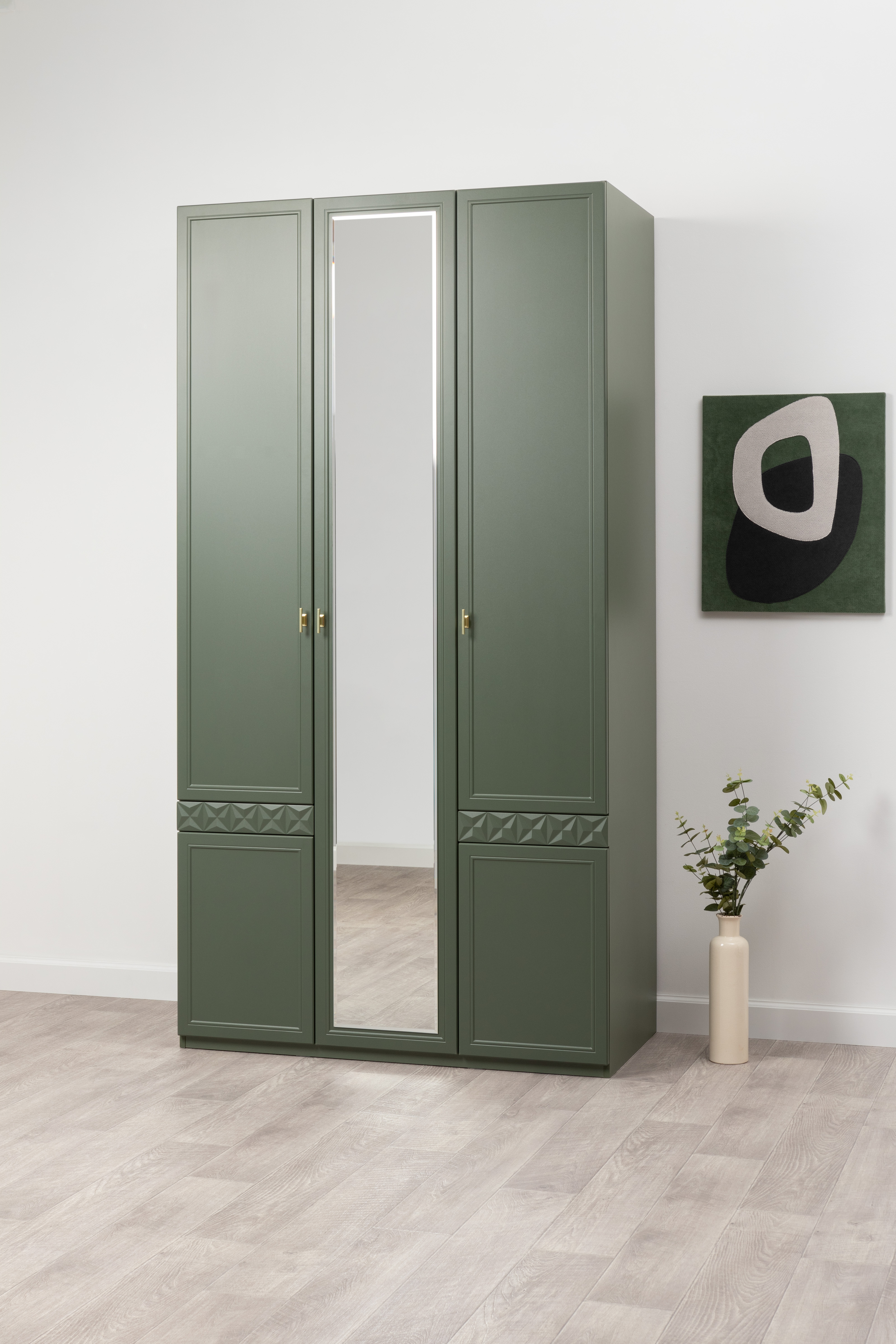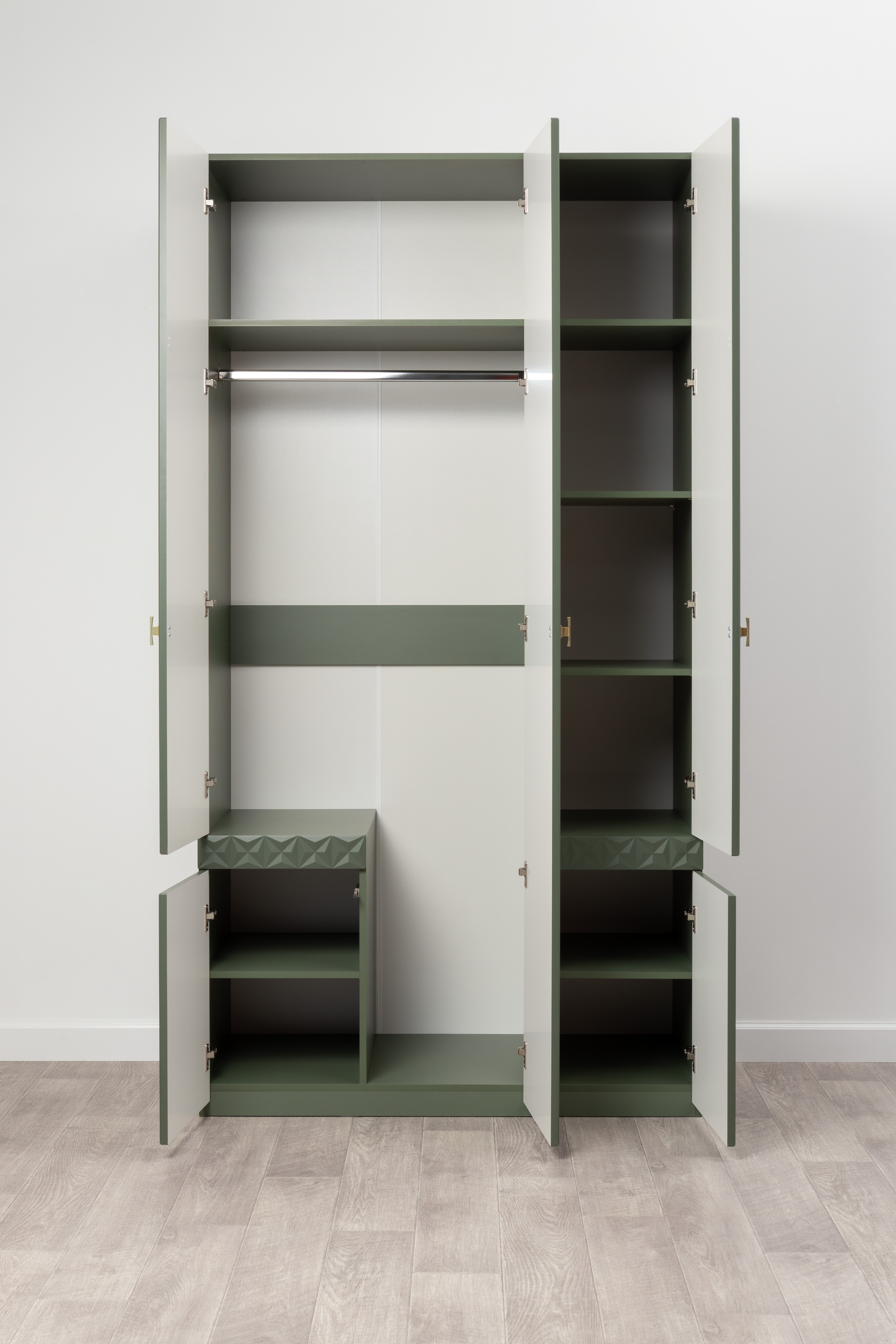 Шкаф для одежды Марион 16.340.03 дымчатый зеленый K521, олива шагрень AG 1050 ПВХ (собирается на любую сторону)