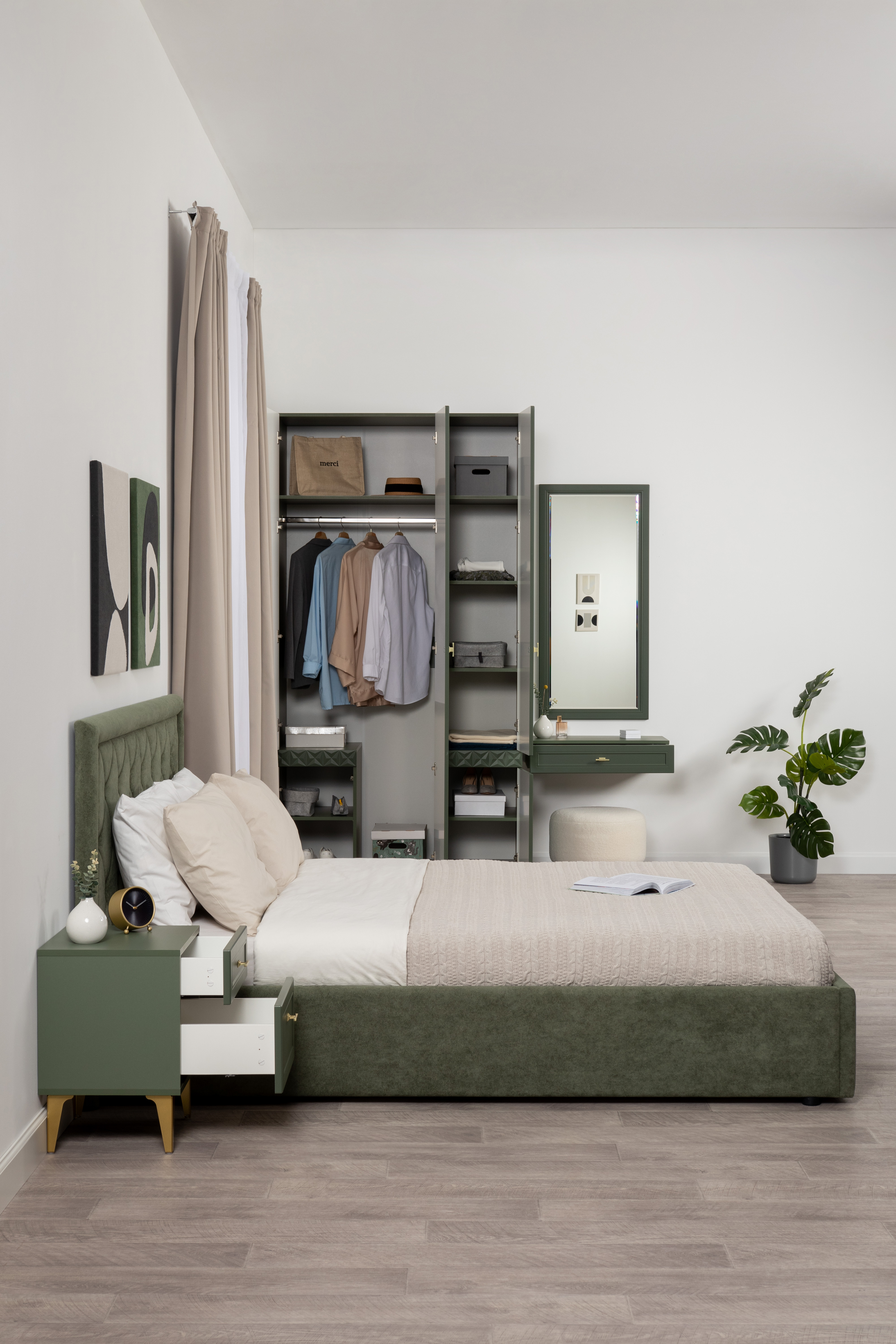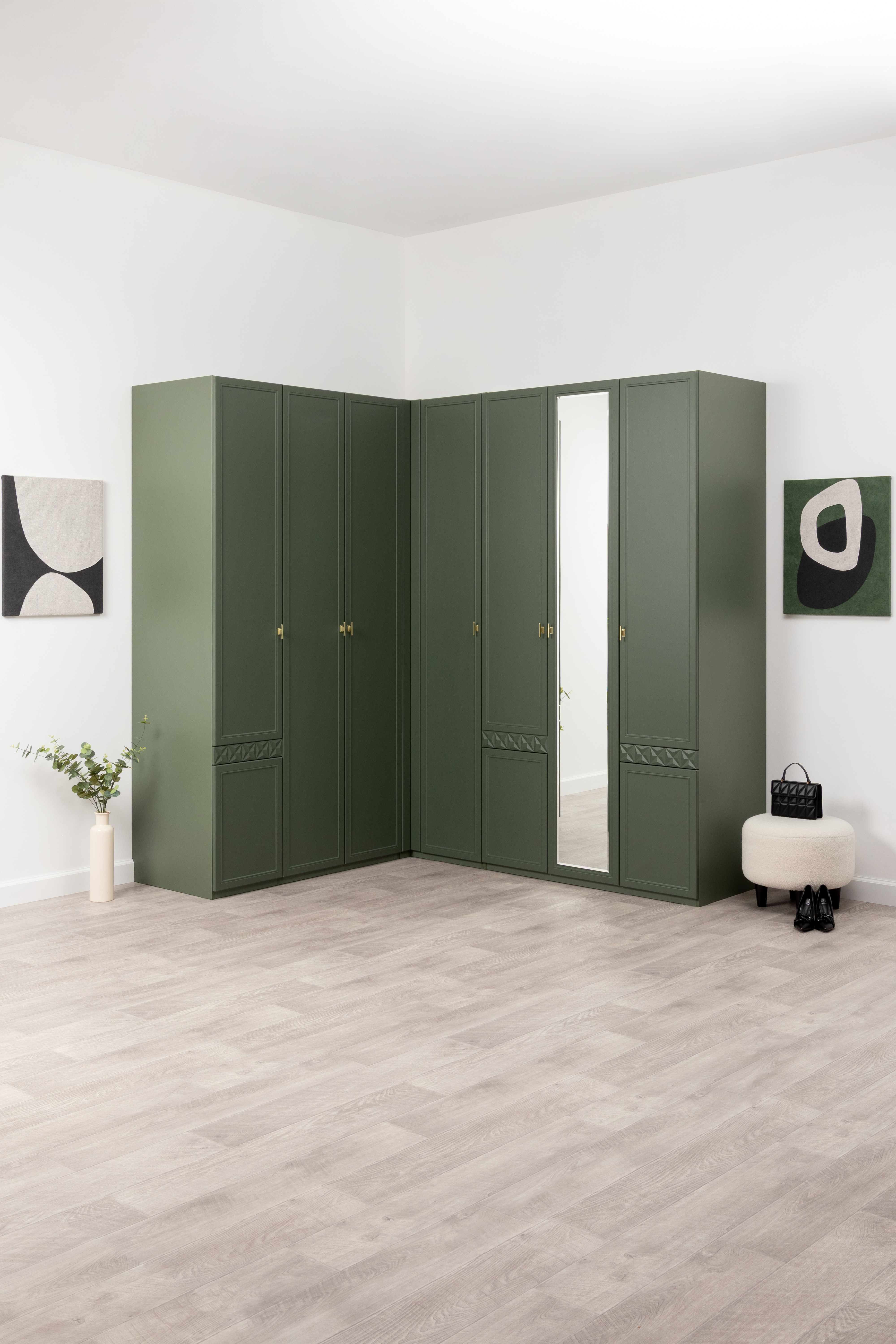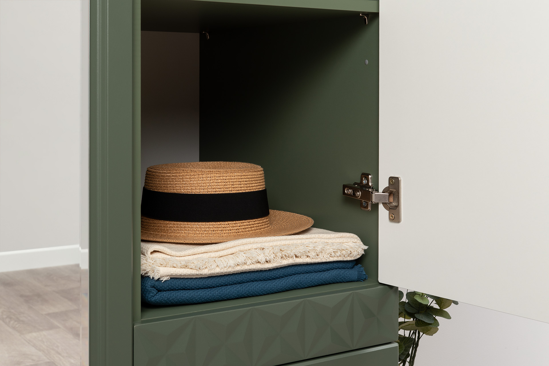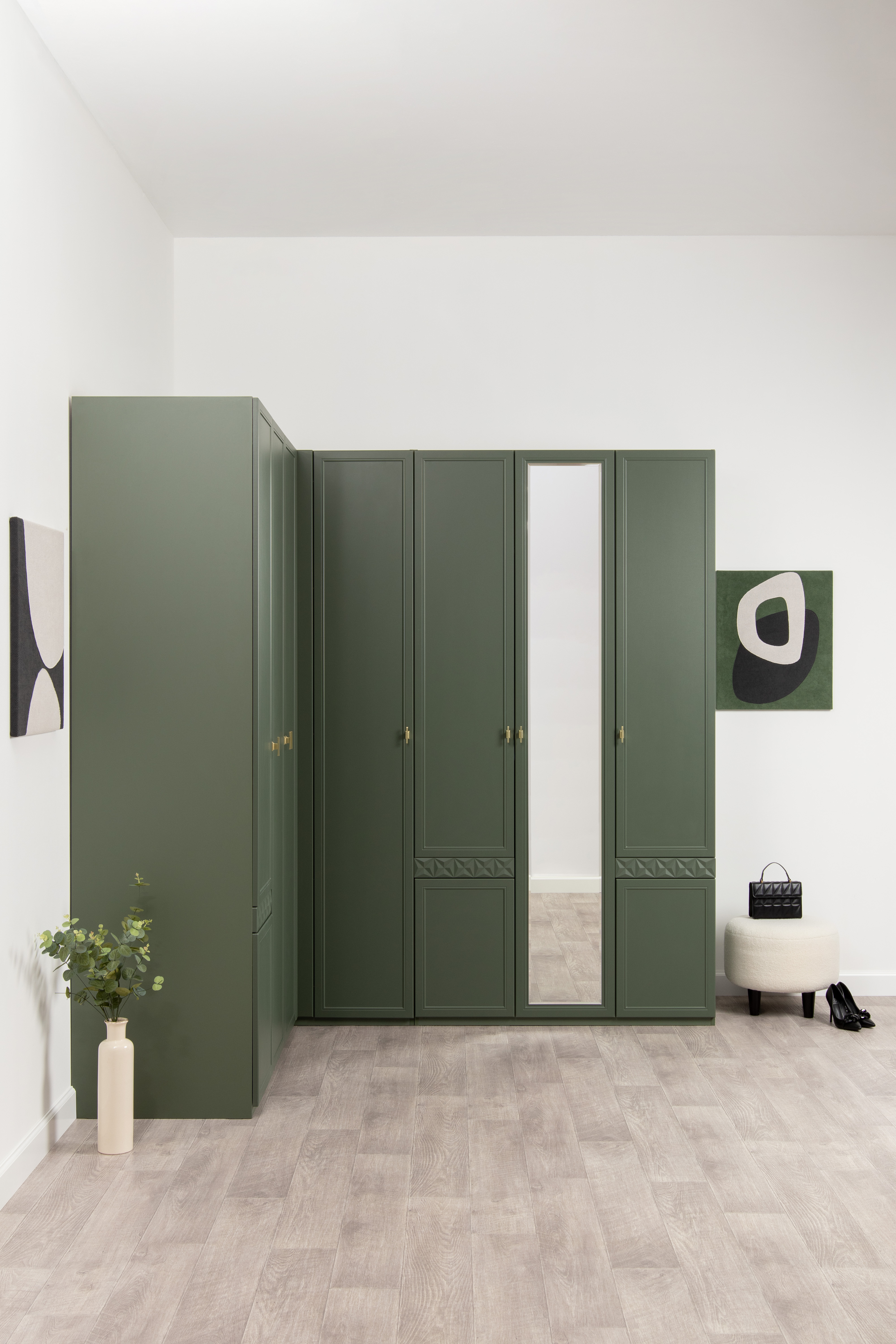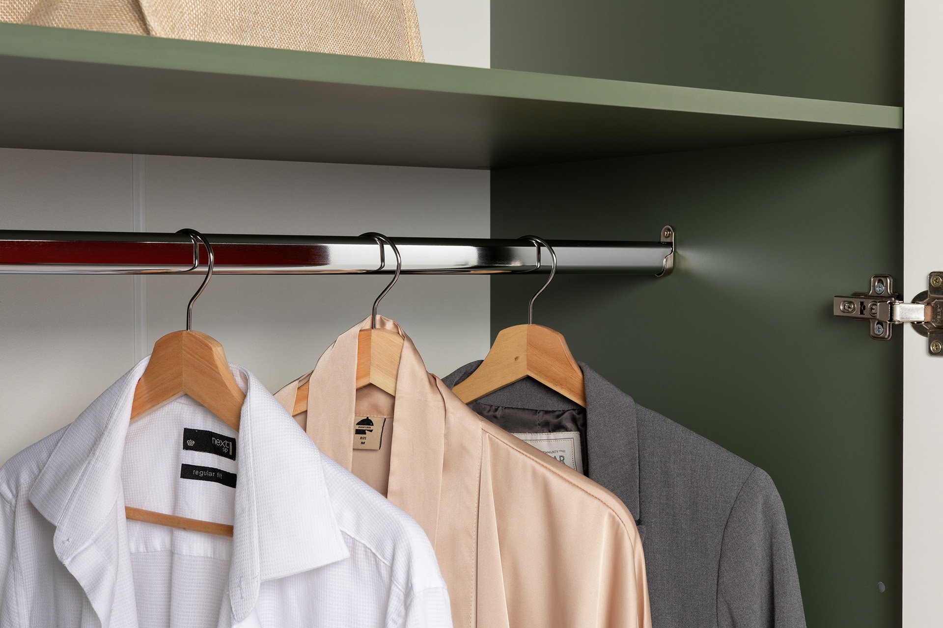 Шкаф для одежды Марион 16.340.03 дымчатый зеленый K521, олива шагрень AG 1050 ПВХ (собирается на любую сторону)