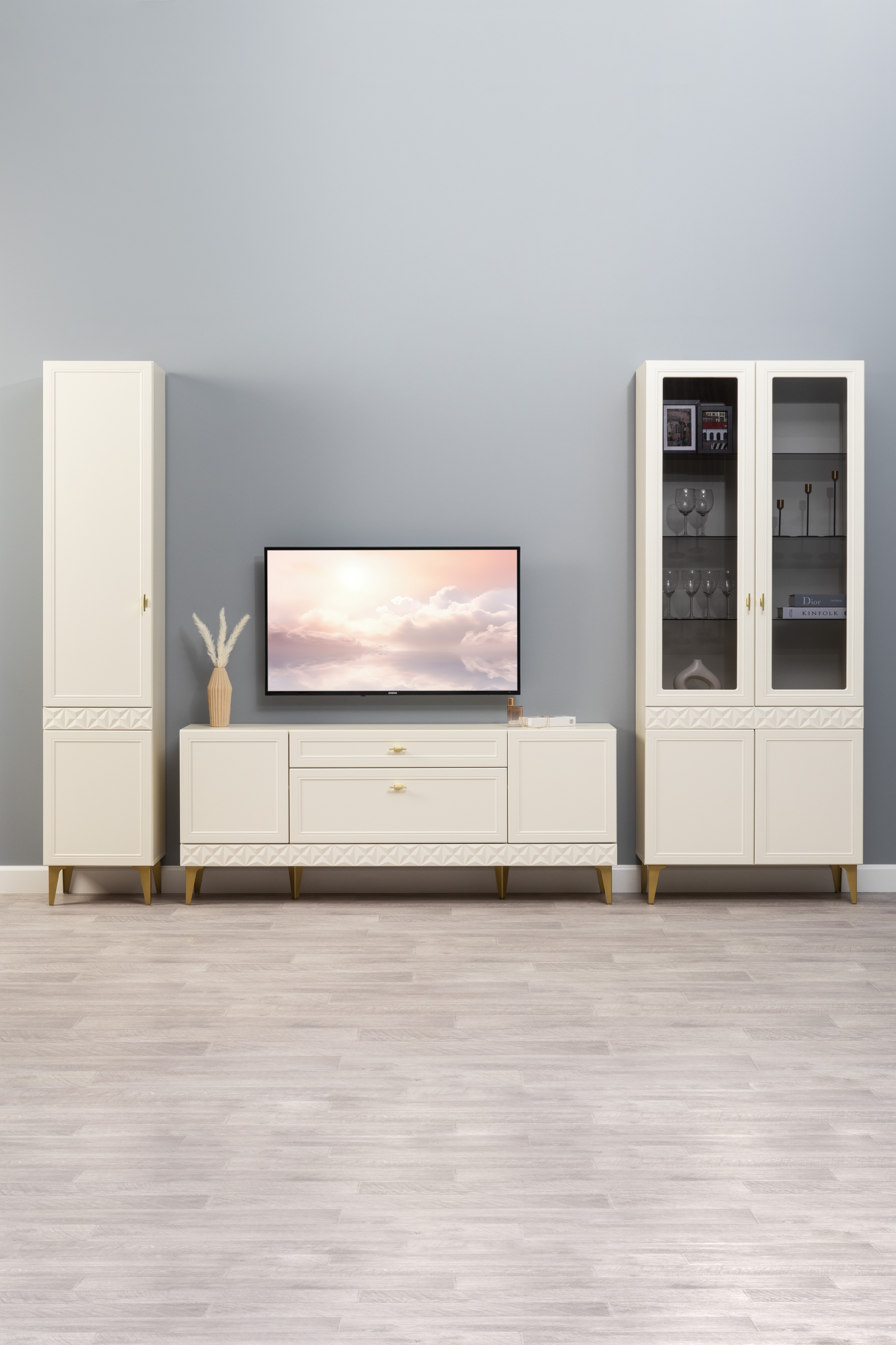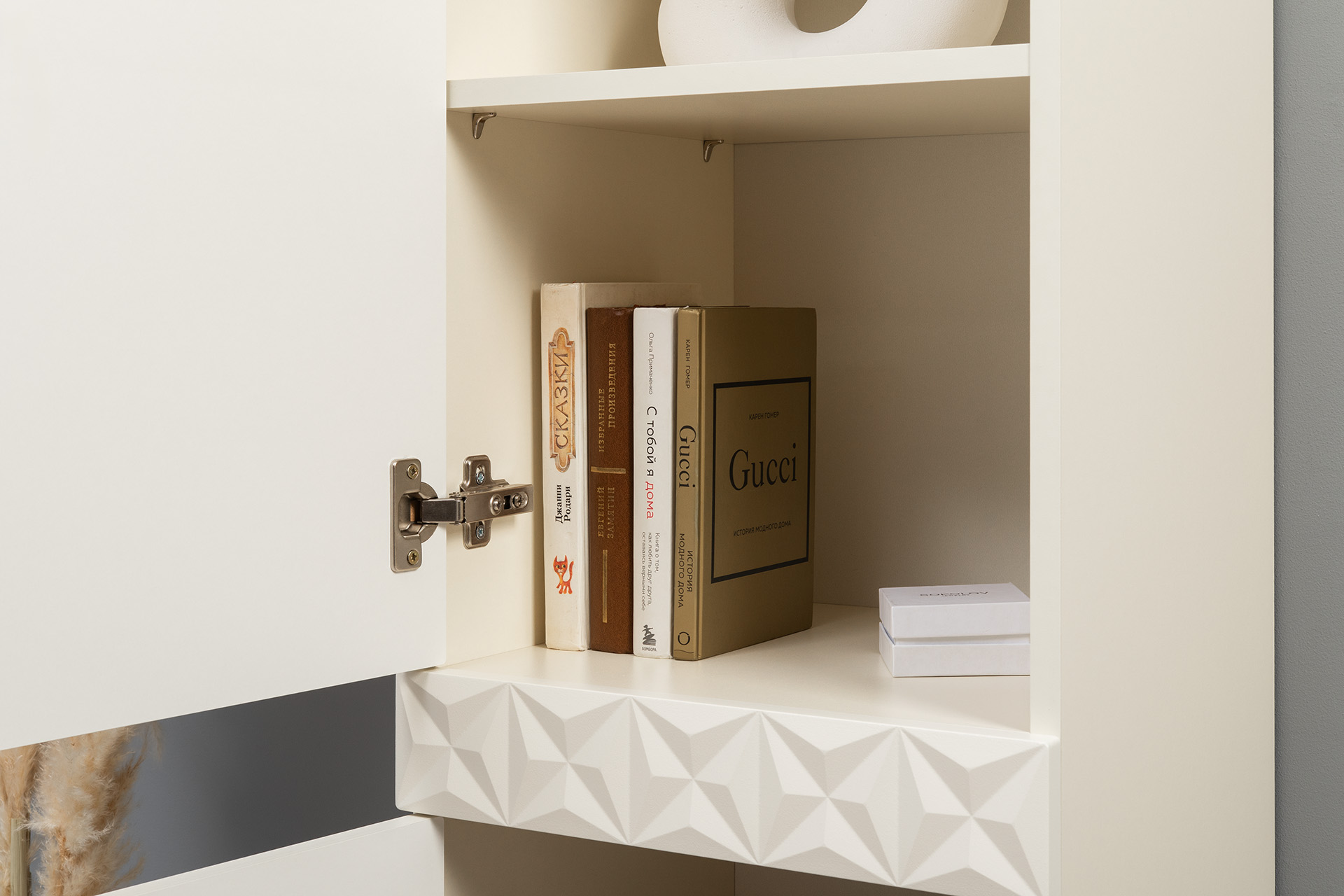Изящные линии, глубокая фрезеровка фасадов из МДФ и благородные оттенки. Утончённая «Слоновая кость» и изысканная «Олива Шагрень» с глубоким зелёным тоном — создают атмосферу уюта, тепла и благородства. Металлические ручки и опоры золотого цвета придают мебели утончённый блеск, а петли и направляющие с доводчиками обеспечивают плавное и бесшумное закрытие фасадов.