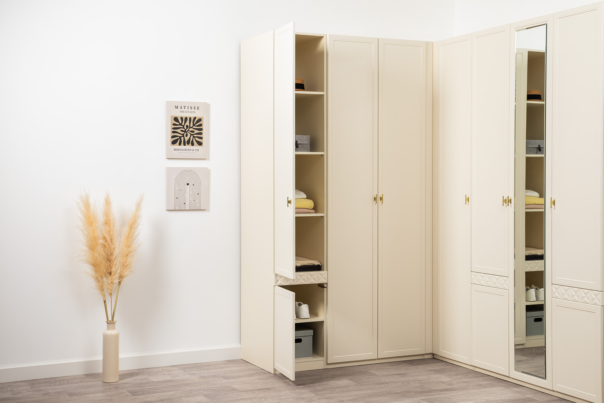 Изящные линии, глубокая фрезеровка фасадов из МДФ и благородные оттенки. Утончённая «Слоновая кость» и изысканная «Олива Шагрень» с глубоким зелёным тоном — создают атмосферу уюта, тепла и благородства. Металлические ручки и опоры золотого цвета придают мебели утончённый блеск, а петли и направляющие с доводчиками обеспечивают плавное и бесшумное закрытие фасадов.