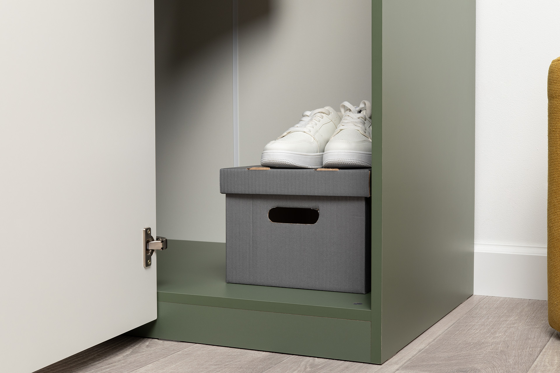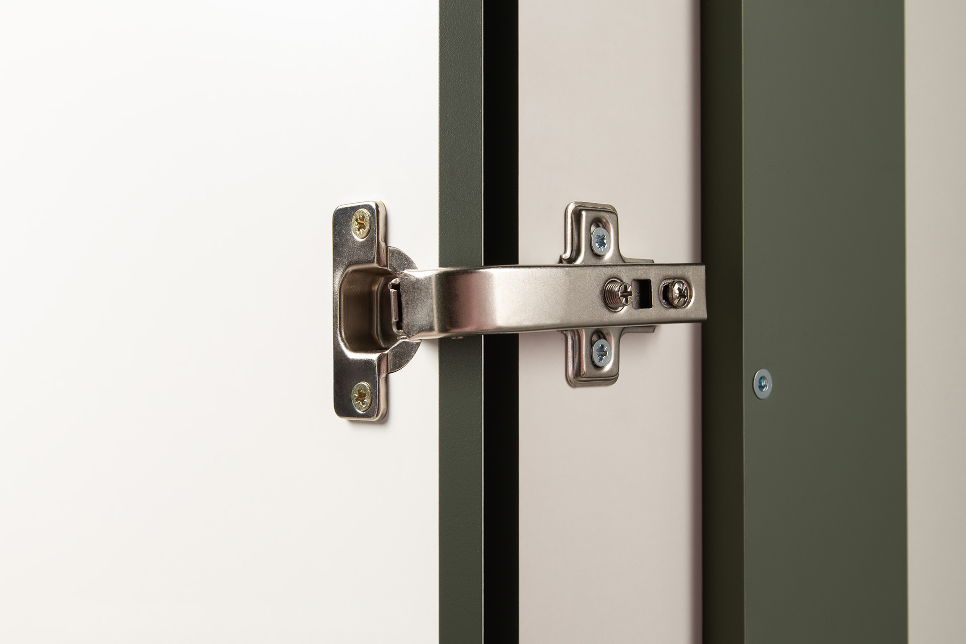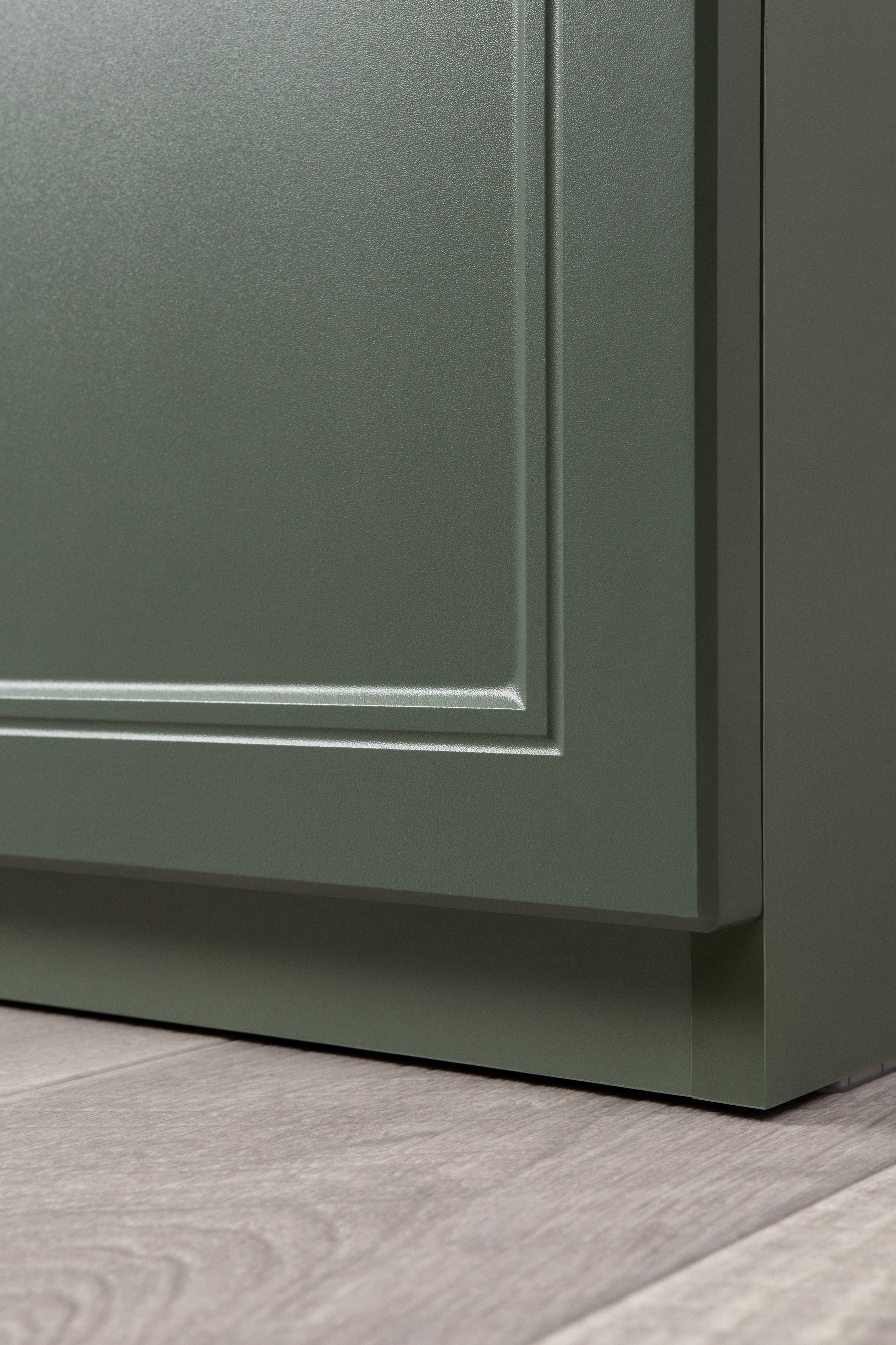 Изящные линии, глубокая фрезеровка фасадов из МДФ и благородные оттенки. Утончённая «Слоновая кость» и изысканная «Олива Шагрень» с глубоким зелёным тоном — создают атмосферу уюта, тепла и благородства. Металлические ручки и опоры золотого цвета придают мебели утончённый блеск, а петли и направляющие с доводчиками обеспечивают плавное и бесшумное закрытие фасадов.