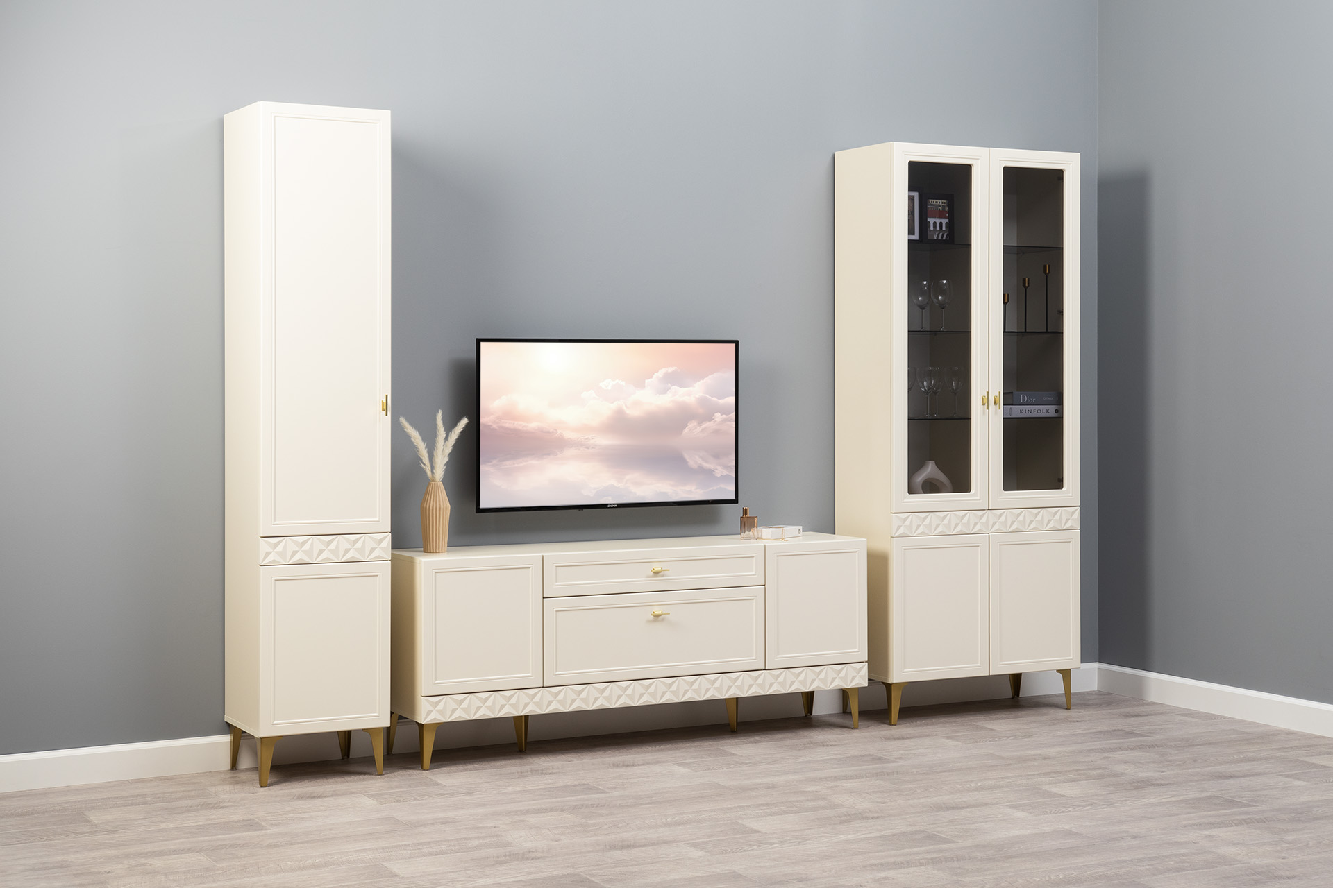 Шкаф-пенал в гостиную Ливерпуль белый, ясень ваниль ПВХ