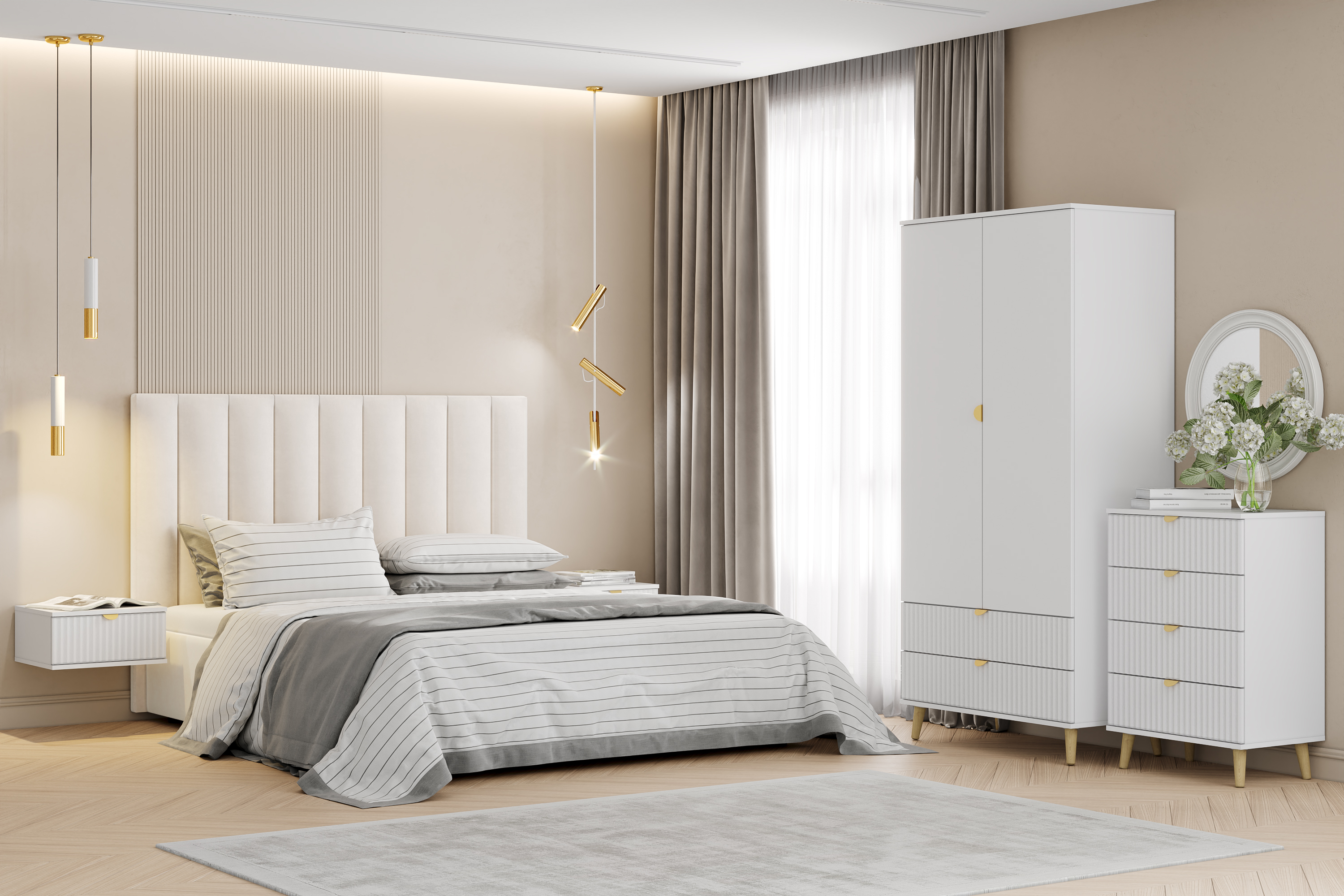 Модульная композиция включает 2 тумбы, оснащенные выдвижными ящиками, которые открываются плавно и бесшумно благодаря шариковым направляющим, комод и шкаф, в котором удобно организовать предметы одежды, при этом высокие опоры облегчают процесс уборки.
