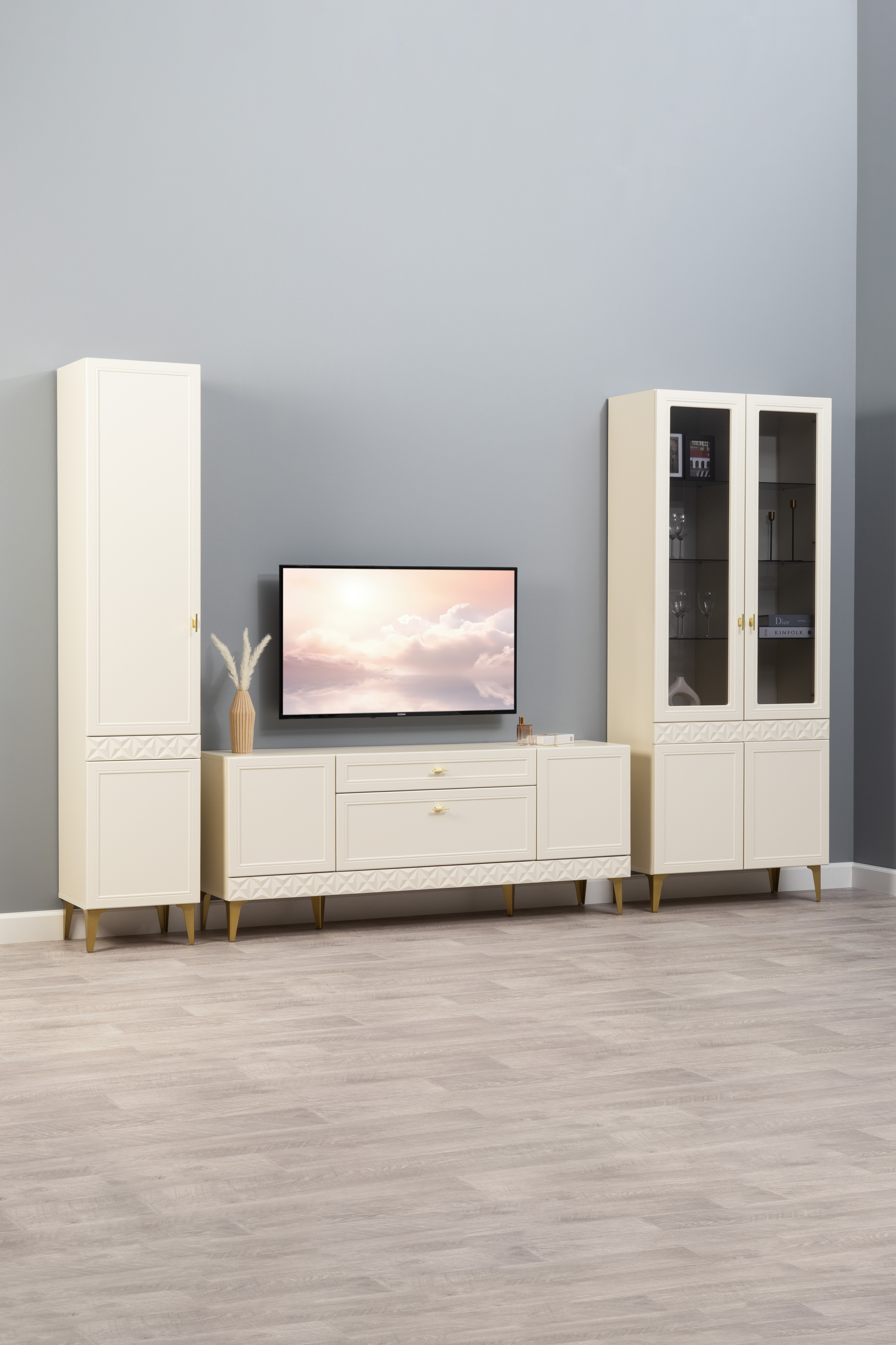 Шкаф-витрина Марион 16.397.01 слоновая кость С341 PE, слоновая кость 6898 ПВХ (собирается на любую сторону)